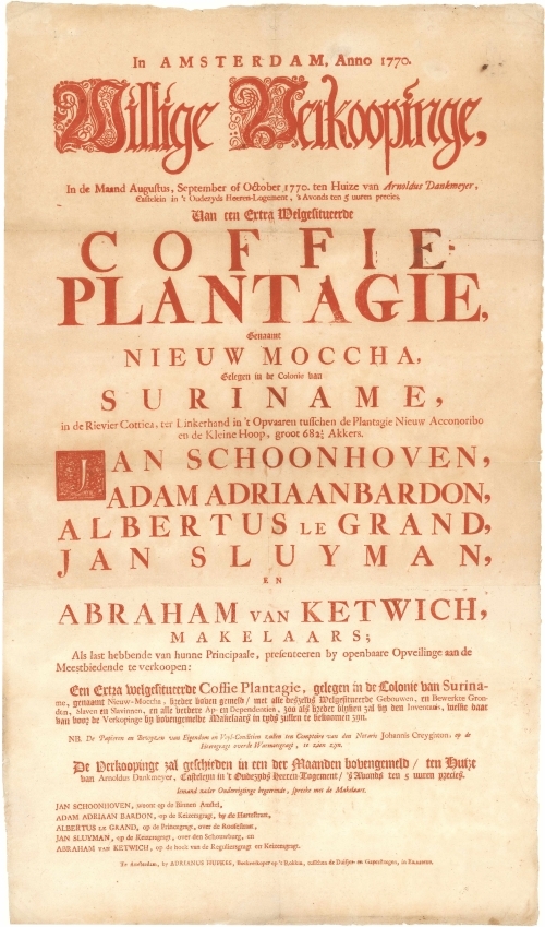 Pamflet met de aankondiging van een plantageverkoop, Amsterdam, ca 1770