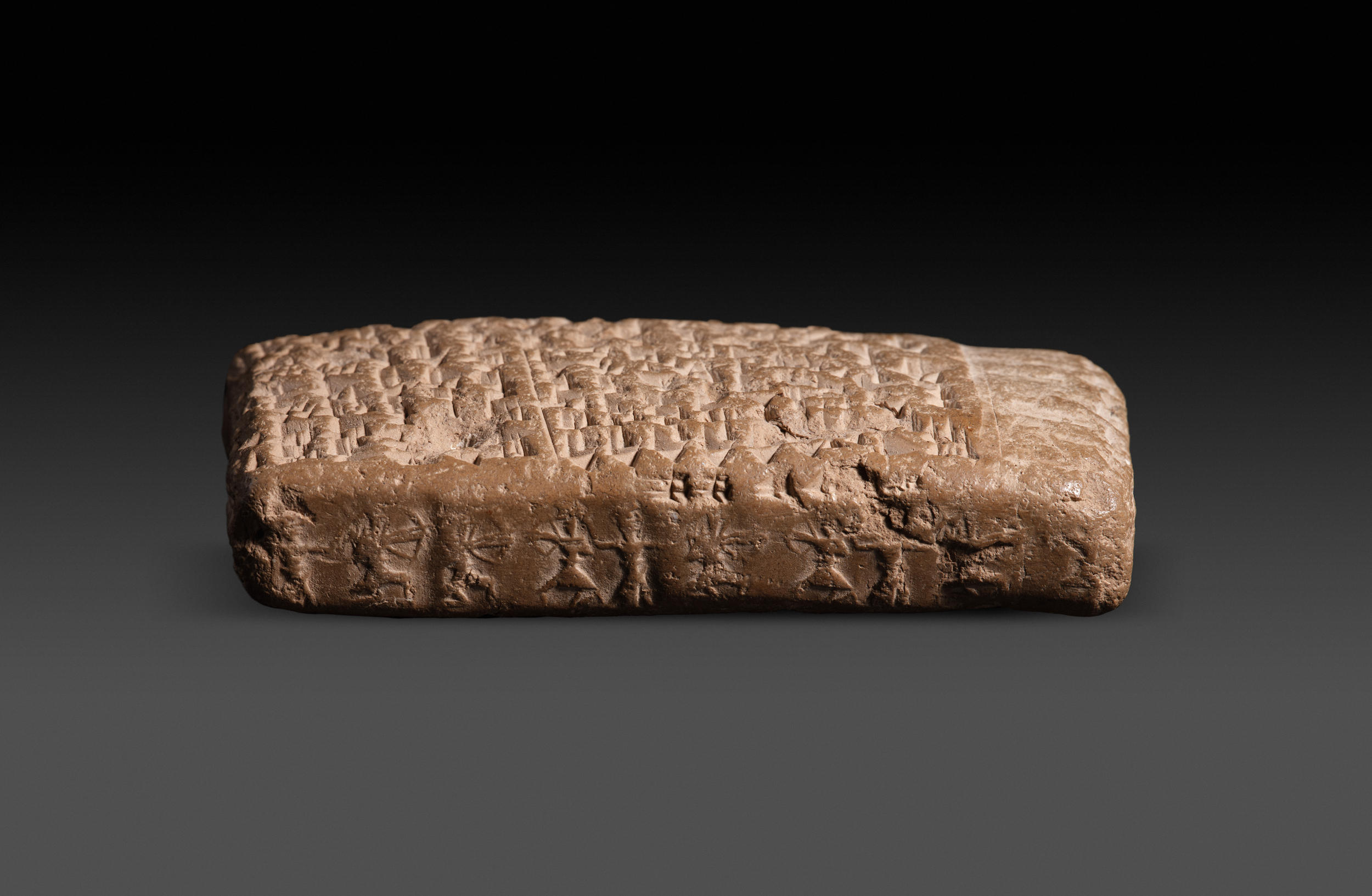 Tablet met spijkerschrift in het Assyrisch. De tekst gaat over de vrijlating en de adoptie van een tot slaaf gemaakte. Klei. 1775 v Christus, het huidige Irak.