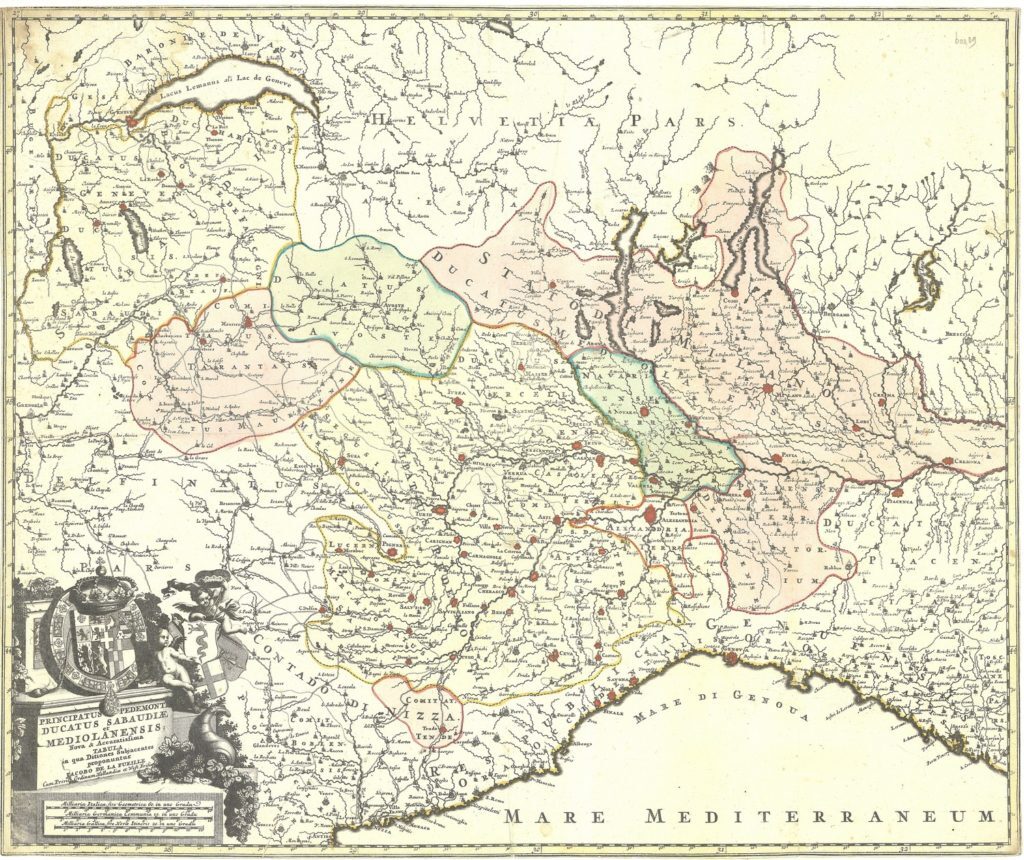 In de rechterbovenhoek is een lege ruimte te zien, waar een opdrachtcartouche had moeten komen. De titel- en schaalcartouche linksonder is echter helemaal voltooid, wat een merkwaardige onevenwichtigheid oplevert. De titelcartouche ziet er uit als een soort monument, met daarop het wapen van Victor Amadeus, en daarnaast de wapens van de Visconti’s (hertogen van Milaan), de stad Milaan en een mij onbekend wapen (wie het kent mag het schrijven). Niet alleen ontbreekt er een cartouche, er is meer onvoltooid. In de hele rechterbovenhoek is vrijwel geen enkele naam te vinden. Rivieren en plaatssymbolen zijn er wel, maar de plaatsnamen moesten nog toegevoegd worden. Ook in de linkerbovenhoek zijn nog een drietal naamloze plaatssymbolen te zien. Het is natuurlijk verleidelijk om aan te nemen dat de kaart onvoltooid is gebleven toen Jacques omstreeks 1706 met de noorderzon verdwenen is en de weduwe geen middelen meer had om de graveur te betalen… De slag bij Turijn kan zelfs aanleiding geweest zijn voor het maken van deze kaart.