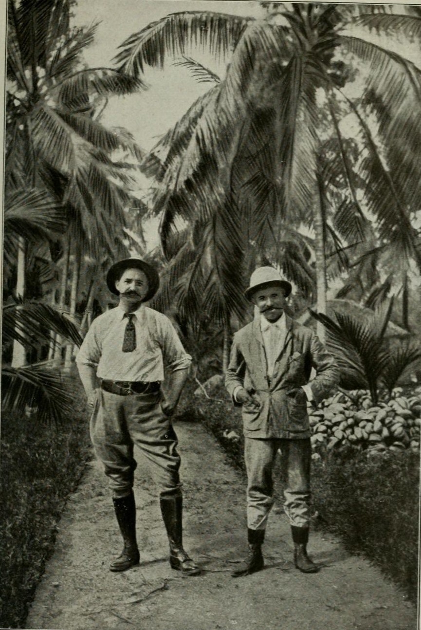 John Hagenbeck (1866-1940) organiseerde het merendeel van de volkerenshows met Indiërs en Sri Lankanen. Hij vestigde zich op Sri Lanka in 1891; deze foto toont hem (links) op één van zijn plantages. Zijn knielange laarzen en wit overhemd met stropdas worden gecompleteerd door een sola topi, ofwel tropenhelm. In India stonden Europeanen bekend als topi wallahs (‘helm-mannen’). De topi symboliseerde beheersing van de tropen: naast bescherming tegen de zon gold het als een medische, hygiënische maatregel – en daarmee als een verlengstuk van ratio en wetenschap. Omdat de topi werd gedragen door ambtenaren, militairen en planters was het een teken van autoriteit binnen de koloniale hiërarchie. De foto suggereert dat Hagenbeck de enige actor is in wat hij een ‘tropenparadijs’ noemde. De Sri Lankanen die Hagenbecks plantages bewerkten, zijn volledig afwezig in deze verbeelding. Daarmee blijven de mensen onzichtbaar dankzij wier arbeid Hagenbeck zijn welvaart en vooraanstaande positie bereikte.