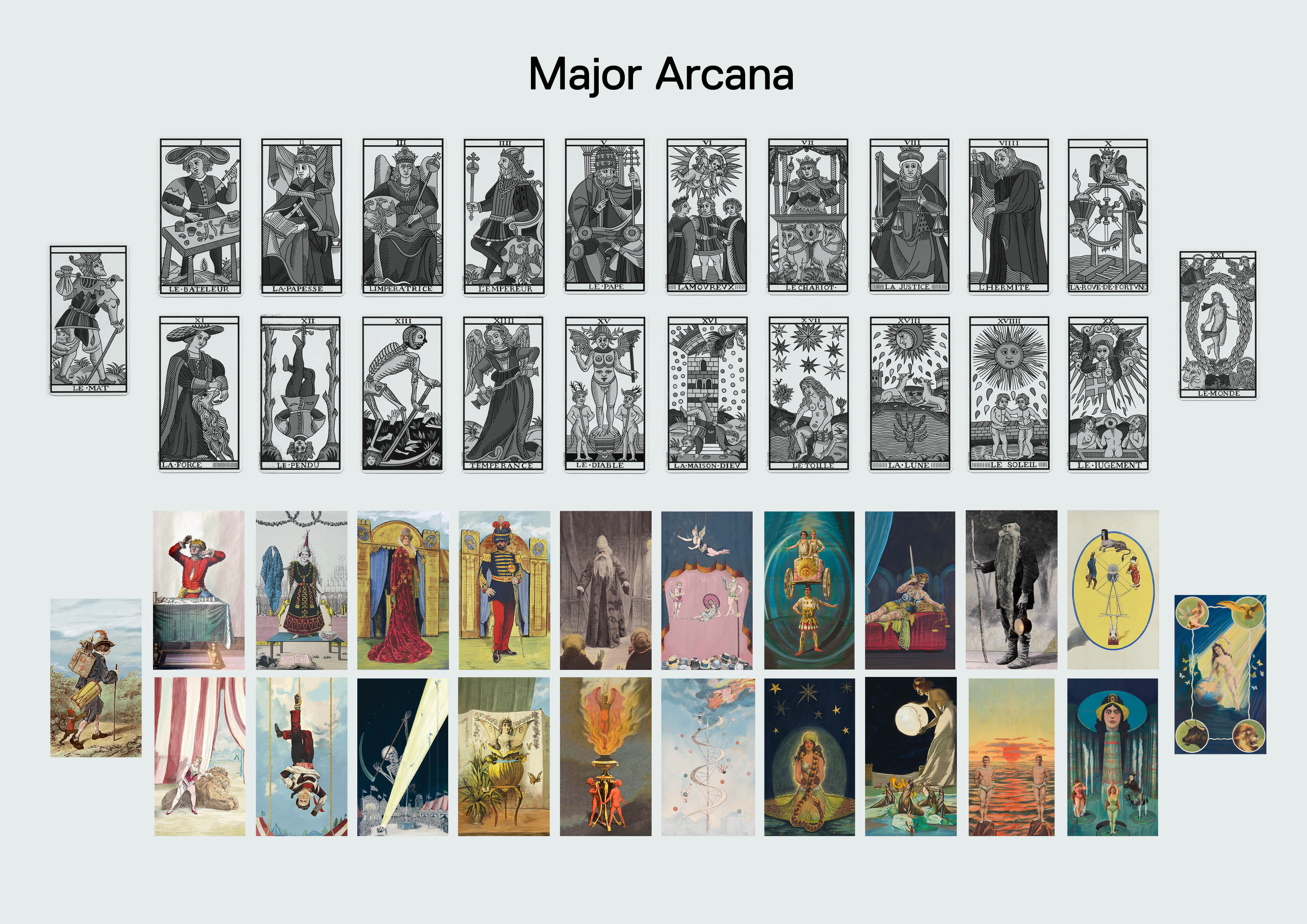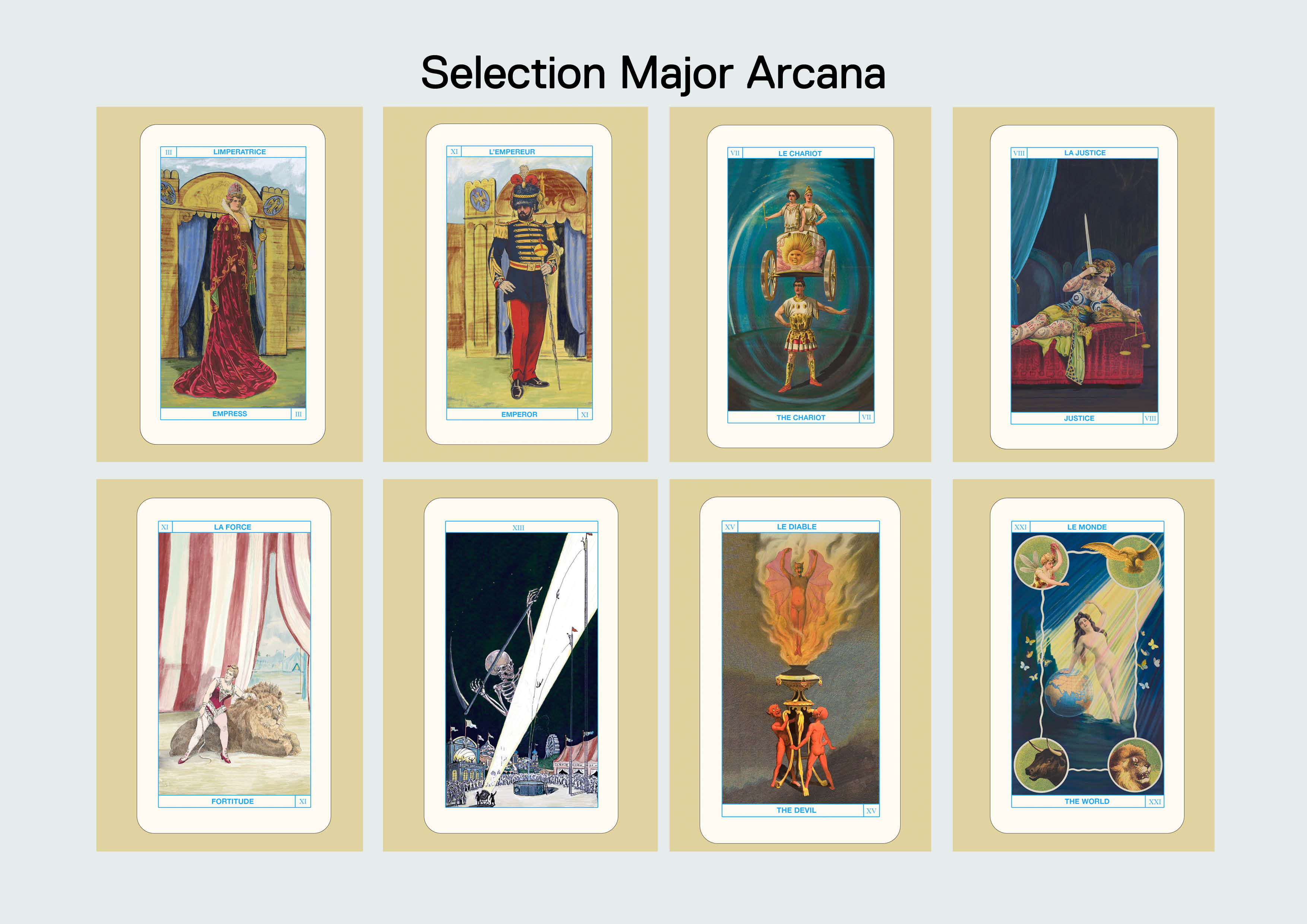 Tarot is ancient but reached a peak in the 19th century when the cards acquired symbolic meaning. It is no coincidence that the cards gained a central place at fairs and related popular entertainment venues. We transform parts of images related to or depicting those 19th century funfairs and circuses to form a Tarot deck.