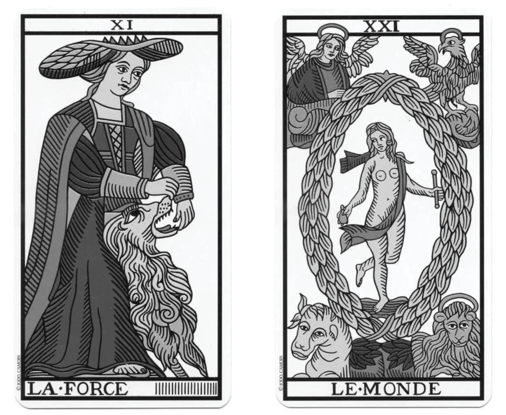 Reference cards from the Tarot de Marseille: La Force, Strength and Le Monde, the World (Camoin - Jodorowsky)