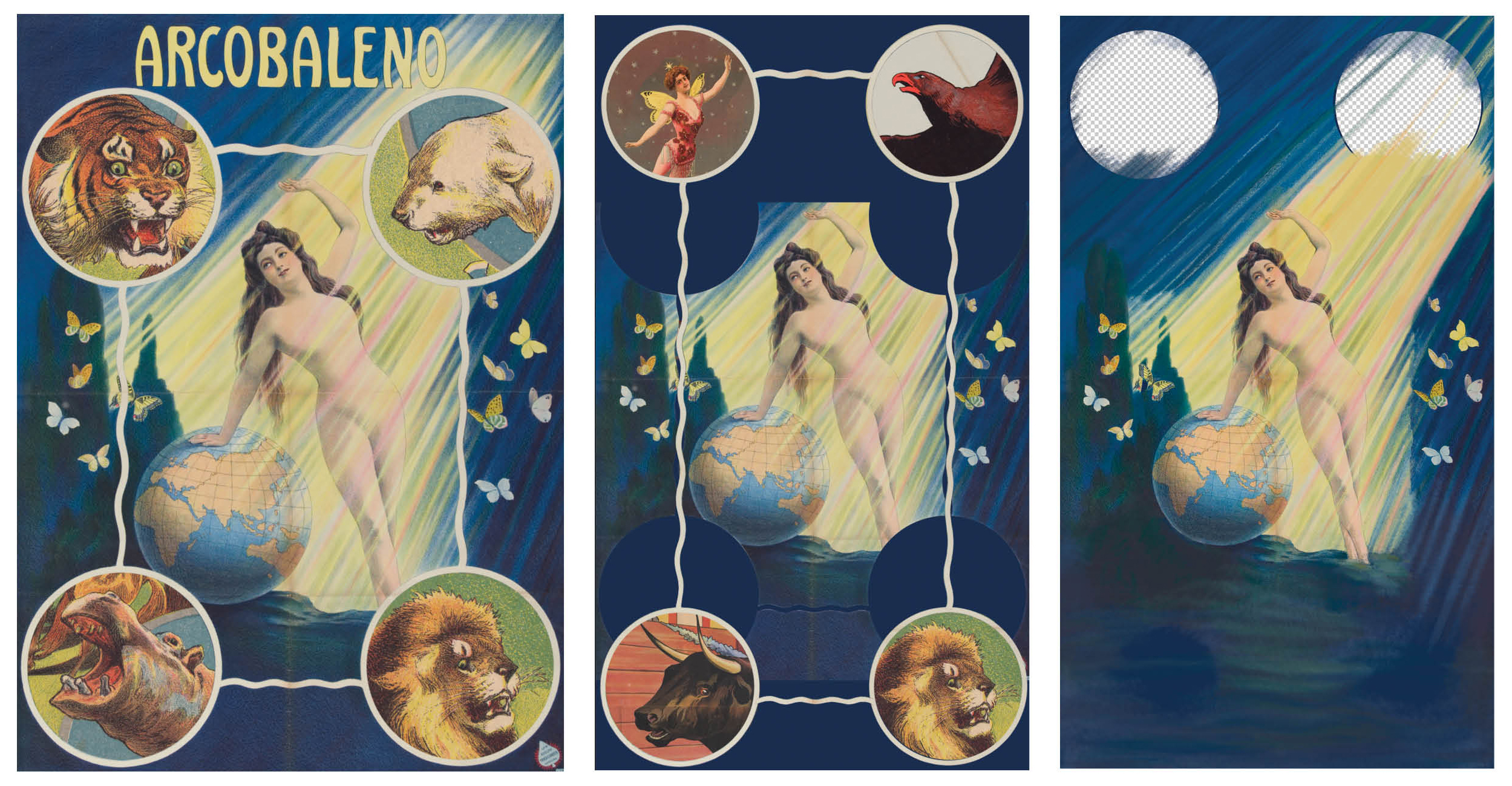 A selection of the images which served as inspiration and building blocks for the Tarot card Le Monde. All images are part of the Allard Pierson Circus and TIN (theatre instituut Nederland) collections (except the two images on the top right).